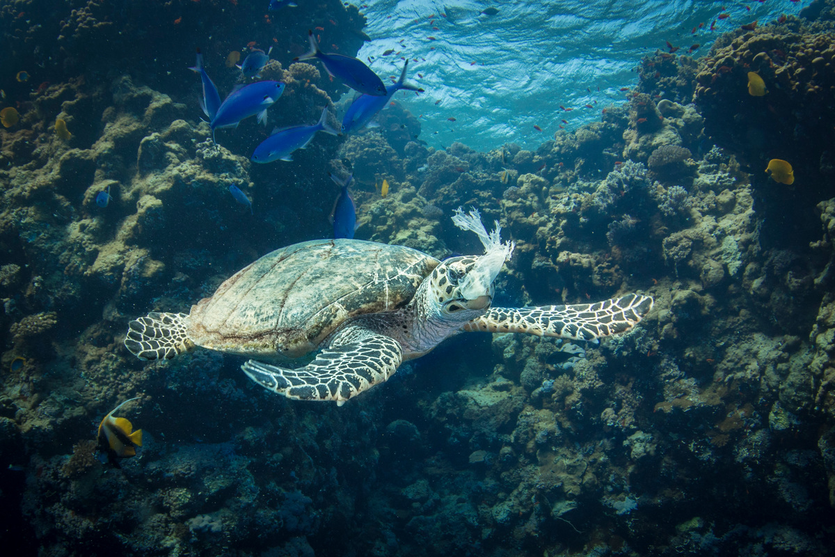埃及紅海中,正有一隻海龜在珊瑚礁群中吃下塑膠 © Saeed Rashid